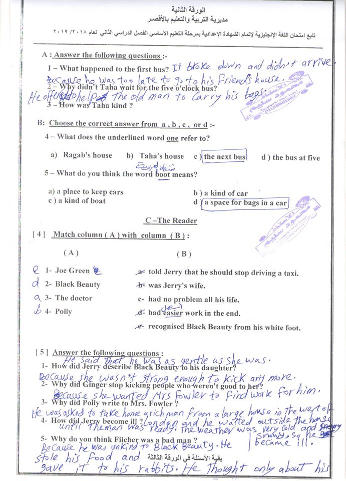 إمتحانات اللغة الانجليزية للصف للثالث الاعدادى بنماذج الاجابات النموذحية لجميع محافظات مصر 2020
