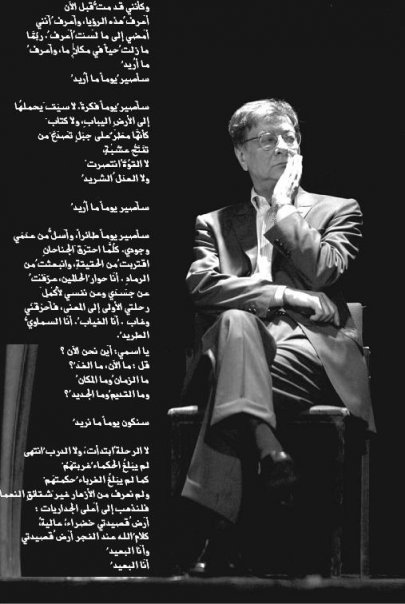 سنكون يوما ما نريد لا الرحلة ابتدأت ولا الدرب انتهى. ف م ن سأكون بعد ك يا أ نا محمود درويش. أرى السماء ه ناك في متناول الأيدي ويحملني جناح حمامة بيضاء صوب طفولة أخرى. لا الرحلة ابتدأت ولا الدرب ا نتهى.